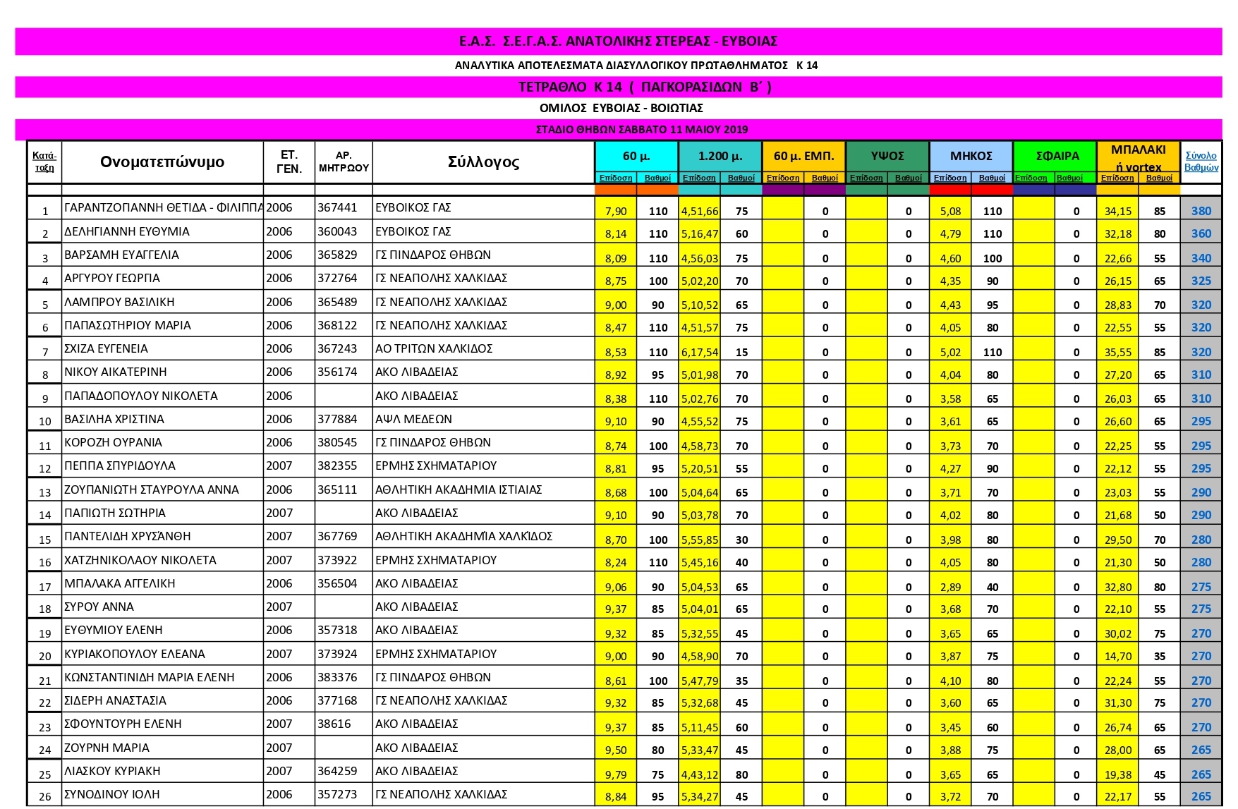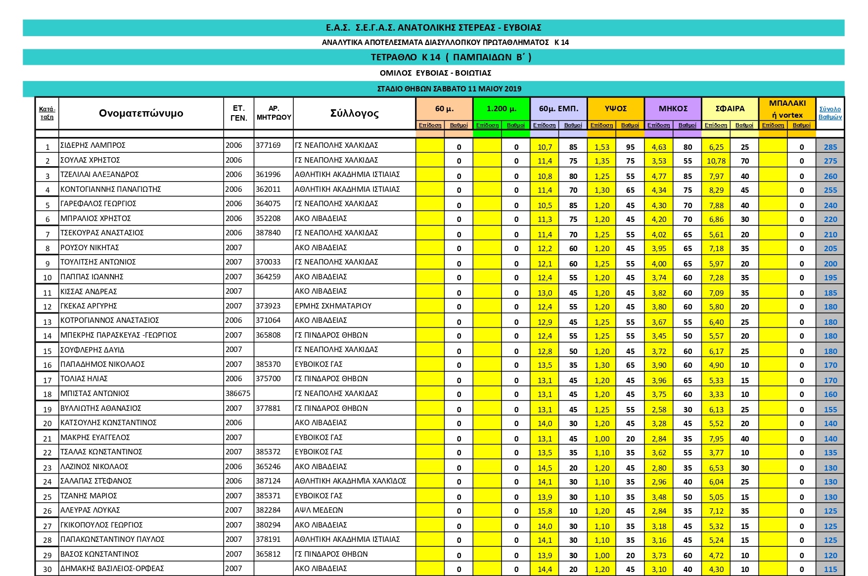 Το Σάββατο 11 Μαϊου πραγματοποιήθηκαν με επιτυχία οι πρώτοι Αγώνες του Διασυλλογικού Πρωταθλήματος Τετράθλου Παμπαίδων & Παγκορασίδων Β΄ του Ομίλου Εύβοιας-Βοιωτίας, στο στάδιο της Θήβας. Αναλυτικά αποτελέσματα: