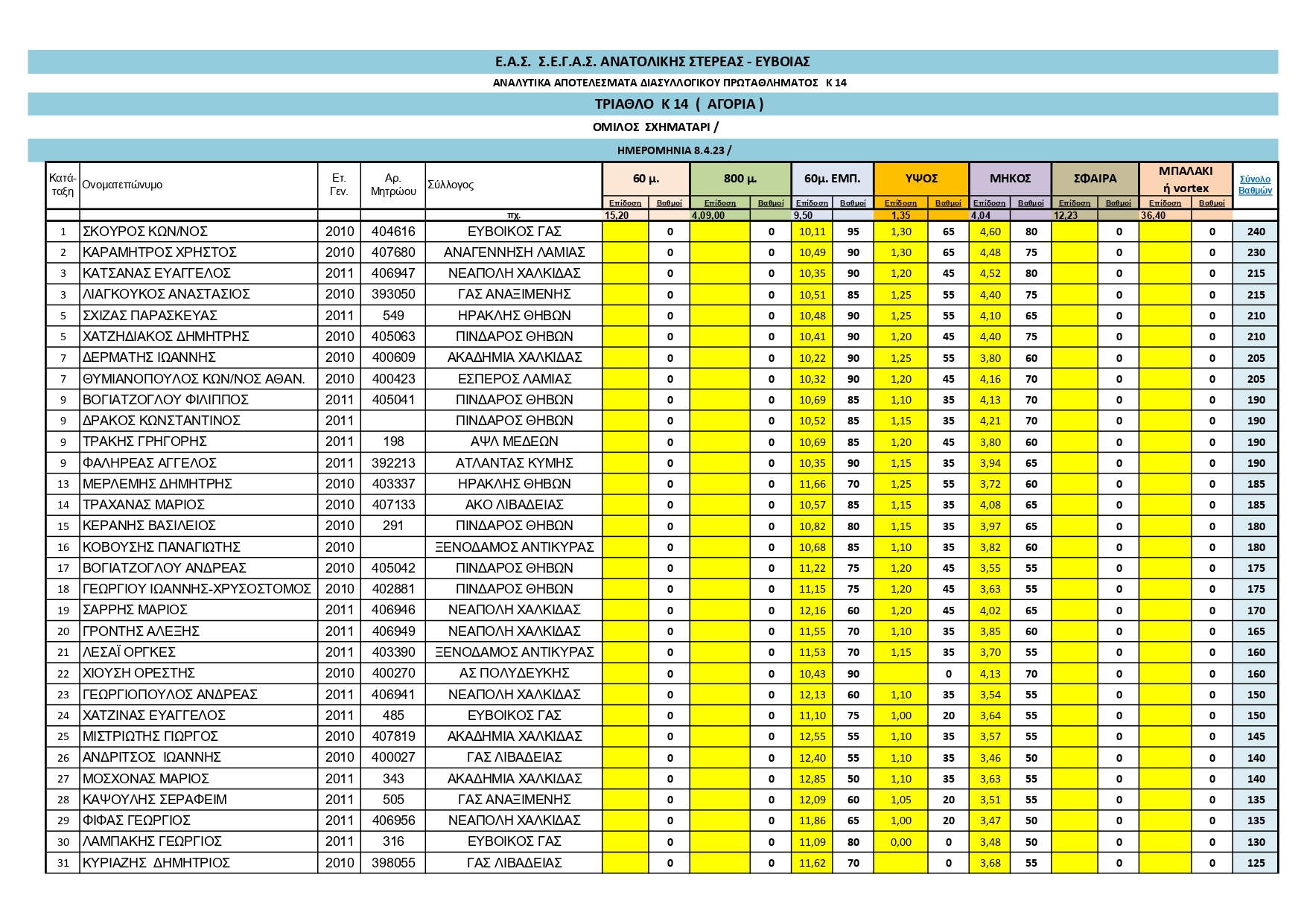 | ΚΑΤΑΤΑΞΗ | ΕΠΩΝΥΜΟ-ΟΝΟΜΑ | ΕΤΟΣ ΓΕΝ. | ΑΓΩΝΙΣΜΑ | ΕΠΙΔΟΣΗ |